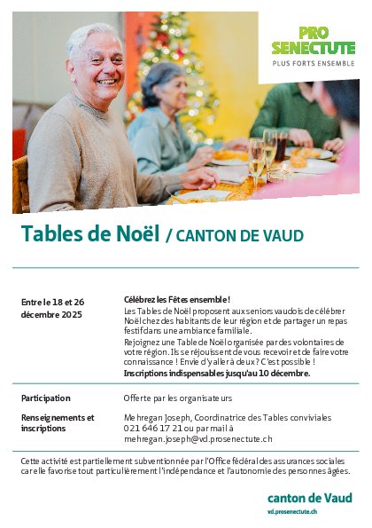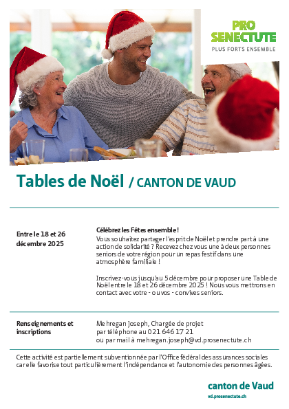 Avec ses tables de Noël, Pro Senectute Vaud propose aux seniors de partager un repas dans une ambiance familiale et festive chez les volontaires de leur région. C'est une occasion pour faire de nouvelles connaissances et vivre les Fêtes autrement. Les Tables de Noël se dérouleront entre le 18 et le 26 décembre.