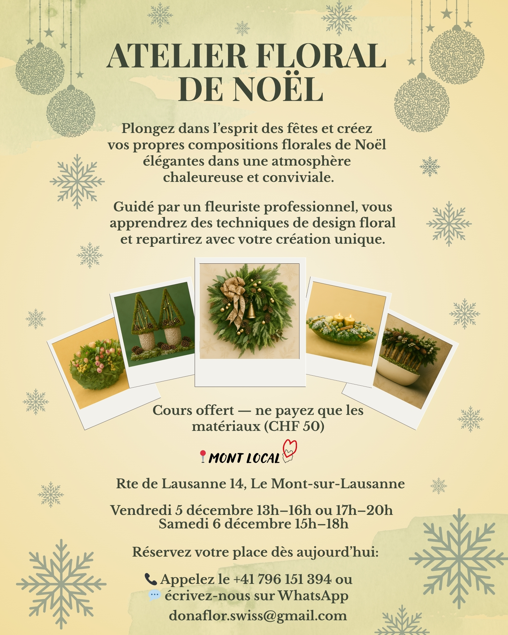 Réservez votre place dès aujourd'hui par téléphone ou WhatsApp au 079 615 13 94 ou par mail à donaflor.swiss@gmail.com. Le cours est offert. Vous ne payez que les matériaux (50CHF).