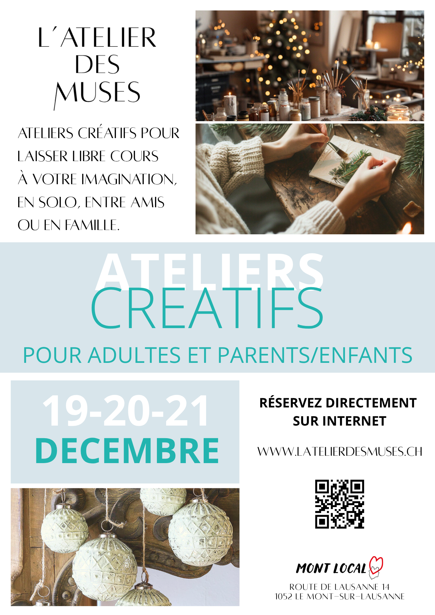 L'Atelier des Muses vous propose 3 jours d'ateliers créatifs au Mont local. Au programme les ateliers : bento cake, vision board 2026, de Noël, bijoux & accessoires et peinture. Réservez votre atelier en ligne sur www.latelierdesmuses.ch