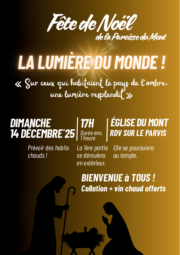 La soirée débutera à 17h le dimanche 14 décembre 2025 sur le parvis de l'église du Mont. Après une première partie en extérieure (prévoir des habits chauds), la fête se poursuivra au temple. Une collation et le vin chaud seront offerts.