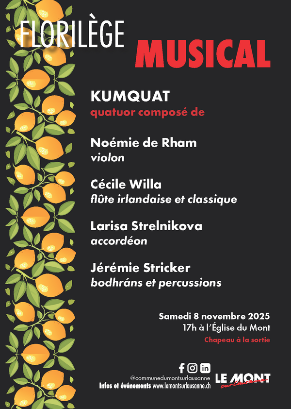 Kumquat, c'est un shot vitaminé 100% local et bio pour celles et ceux qui veulent danser ! Né en 2023, le quatuor de musique néo-traditionnelle irlandaise s'autorise parfois quelques écarts vers l'Écosse, la Bretagne, ou encore vers la composition inédite. Son répertoire regroupe des tunes (pièces traditionnelles) allant de l'époque baroque aux pièces actuelles.